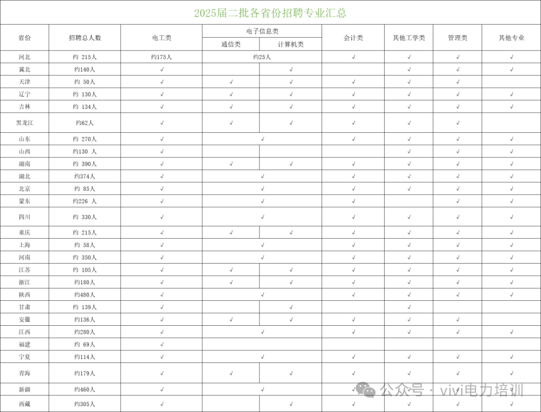 一、提前批 26届提前批一般在9月份发布公告,校园宣讲一般在9-10月份进行,大部分电力公司会在国家电网人力资源招聘平台上发布校园宣讲行程。 01、招聘对象 提前批招生的对象基本都是针对一些985、211重点院校电气类的研究生及以上学历,少量招收本科生或者原电力部直属院校的学生。 02、招聘专业 主要面向电工类、少量招收计算机类和通信类专业的硕士研究生。 03、招聘流程 发布公告→报名→宣讲会(投递简历)→笔试→签订就业意向→申报审核 04、招聘形式 招聘形式有三种情况: ①线下宣讲会现场进行面试,通过考核后,可直接签约意向单位,不需要参加统一的招聘考试。 ②线下宣讲会现场进行笔试,符合要求的同学可参加该省自行组织的笔试考试,通过后参与单位组织的面试,合格后可直接签约。 ③线下宣讲会现场进行面试,符合要求的同学需要参加12月的统一笔试,通过后不需要参加面试。 具体的招聘情况要以各单位的要求为准。 二、一批招聘考试 例如:26届一批国网考试公告发布时间为2025年10月18日,考试时间在2025年12月7日。各省公司招聘公告发布后,各位考生需及时查看意向单位的招聘要求,自己的专业及条件是否符合。明确网申上传资料要求、网申的截止时间。 01、招聘对象 (1)电工类:大部分省份要求公办二本及以上学历报考。 电工类专科一批可以报考的省份有:西藏省、新疆省、四川省偏远地区。 (2)非电类:公办二本及以上学历。 02、招聘专业 电工类、计算机类、通信类、其他工学类、财会类、金融类、其他类、管理类 03、招聘流程 发布考试大纲→发布招聘公告→网申报名→资格面审→笔试考试→面试考试→拟录取通知短信→公示名单→体检、签约→入职 04、关于考试 一批的考试时间在年前12月份进行。 国家电网招聘考试笔试形式为线下机考,笔试分值满分100分,考题数量均为165道;考试时长为180分钟,笔试内容包括公共与行业知识+专业知识。 面试分为结构化、半结构化、无领导小组三种形式。各省份具体的面试形式以公告为主。 26届一批各省招聘专业如下图,供大家参考。 25届一批各省招聘专业如下图,供大家参考。 三、二批招聘考试 二批较一批相比招聘人数少,岗位少,竞争压力也随之增加。26届二批发布时间约为2026年3月前,考试时间大概在2026年3月中旬。 01、招聘对象 1.电工类:大多数省份专科以上学历就可以报考,但有些省份对学历有具体要求。 特别注意: ①独立院校不能报考的省份有:天津、浙江、江苏、上海、北京; ②专科生不能报考的省份有:天津、浙江、江苏、上海、北京、冀北; ③根据近几年的录取公示来看,部分省份招聘民办院校应届毕业生,例如:河南、吉林、辽宁、福建、陕西、江西,详情请咨询人资。 2.非电类:要求考生公办二本及以上学历才能报考。 辽宁省、吉林省、宁夏、重庆市一批只招电工类,非电专业的考生二批才可以报考。 02、招聘专业 电工类、计算机类、财会类、通信类、其他工学类、金融类、管理类、其他类。 03、招聘流程 发布招聘公告→网申报名→资格面审→笔试考试→面试考试→拟录取通知短信→公示名单→体检、签约→入职 04、关于考试 二批考试在年后3月份进行。 国家电网招聘考试笔试形式为线下机考,笔试分值满分100分,考题数量均为165道;考试时长为180分钟,笔试内容包括公共与行业知识+专业知识。 面试分为结构化、半结构化、无领导小组三种形式。各省份具体的面试形式以公告为主。 25届二批各省招聘专业如下图,供大家参考。 四、三批招聘考试 公告显示:26届三批考试公告发布时间为2026年5月前,笔试时间2026年5月。三批其实就是国网三产单位。 所谓的三产单位就是指旗下的非核心业务单位,这些单位不直接参与电力生产和传输,但为电力系统提供全方位的支持和服务。例如:设备运维、生活服务、技术延伸、金融支撑等。 01、招聘对象 除极个别省份的特殊岗位外,基本要求本科及以上学历,部分省份电工类岗位可招收专科生。以25届三批为例: 02、招聘专业 以电工类为主,同时涵盖电子信息类、其他工学类、财会类、管理类等专业,具体以各单位招聘公告为准。 03、招聘流程 发布招聘公告→网申报名→资格面审→笔试考试→面试考试→拟录取通知短信→公示名单→体检、签约→入职 04、关于考试 三批考试在年后5月份进行。 国家电网招聘考试笔试形式为线下机考,笔试分值满分100分,考题数量均为165道;考试时长为180分钟,笔试内容包括公共与行业知识+专业知识。 面试分为结构化、半结构化、无领导小组三种形式。各省份具体的面试形式以公告为主。 五、农电工招聘考试 大多数省份还有农电工的招聘,对于报考国网失利的同学还是有另外一条进电网的道路-供电服务公司,也就是大家常说的农电工。 01、招聘对象 大部分岗位要求全日制大专及以上学历。 02、招聘专业 招聘专业以电工类为主,兼顾部分非电工类专业。具体以公告为主。 03、招聘流程 发布招聘公告→网申报名→资格面审→笔试考试→面试考试→公示→体检→签约→入职 04、关于考试 农电工考试通常在4月5月6月陆续开展招聘。 由各省份公司独自组织招聘。 作为一名符合条件的应届生,若未能赶上某一批次的选拔,后续仍有充分机会。错过提前批,仍可报考第一批,即便一批未通过